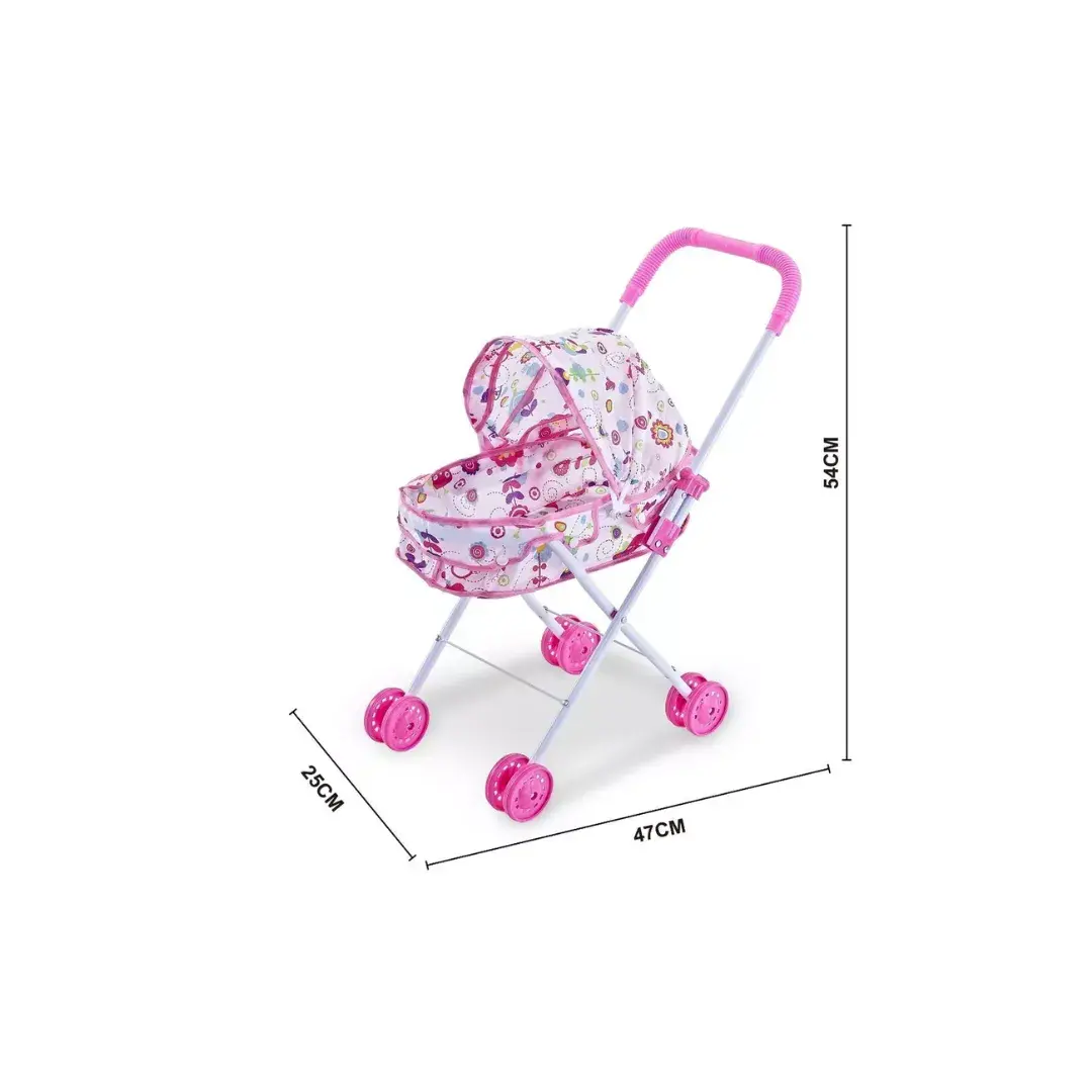 Cuenta con una estructura liviana y resistente, ruedas dobles para un desplazamiento suave y capota plegable que le da un diseño encantador. Su tamaño es ideal para uso en interiores y exteriores, fomentando la imaginación, la creatividad y el juego simbólico.