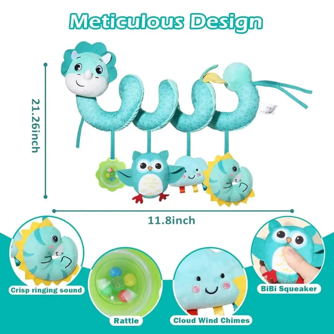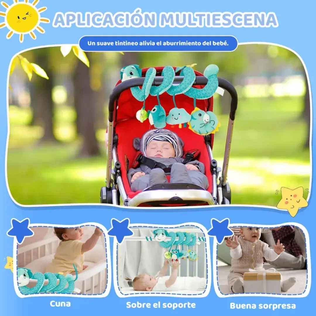Divertido juguete espiral con sonajero ideal para estimular los sentidos de tu bebé. Se adapta fácilmente a cunas, cochecitos o portabebés y ayuda al desarrollo de la coordinación y curiosidad desde los primeros meses.