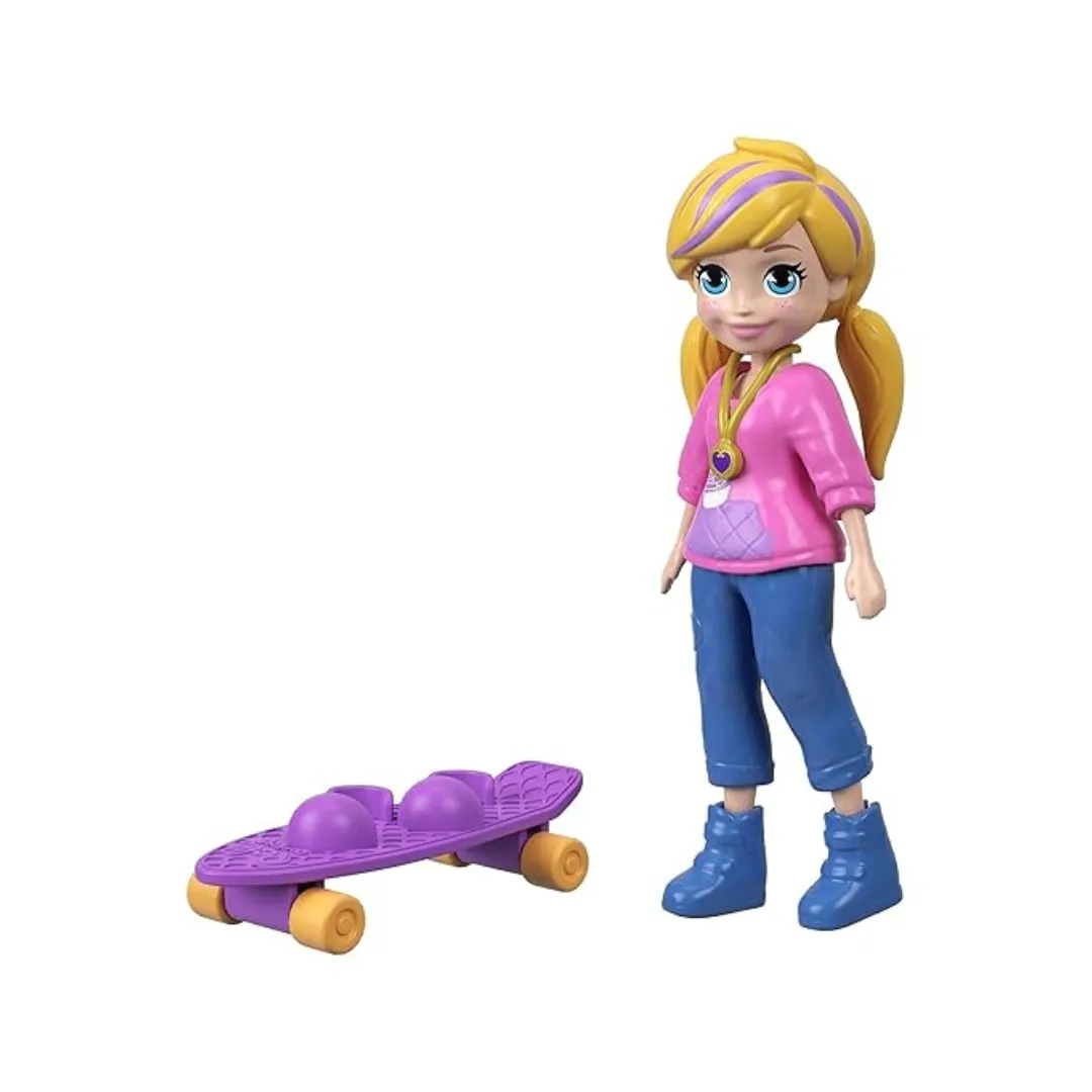 - Polly está lista para la acción con su patineta morada que le permite deslizarse y divertirse.