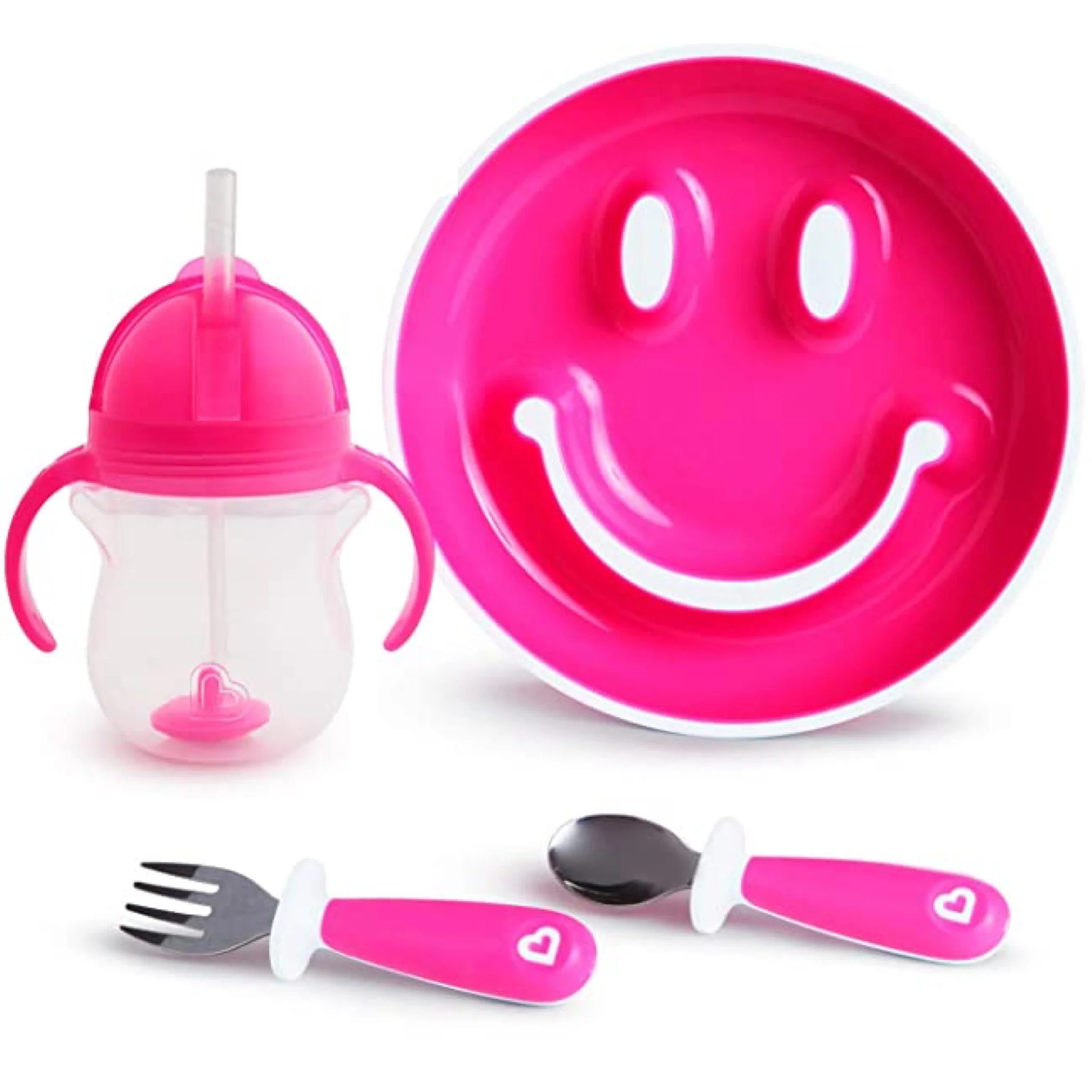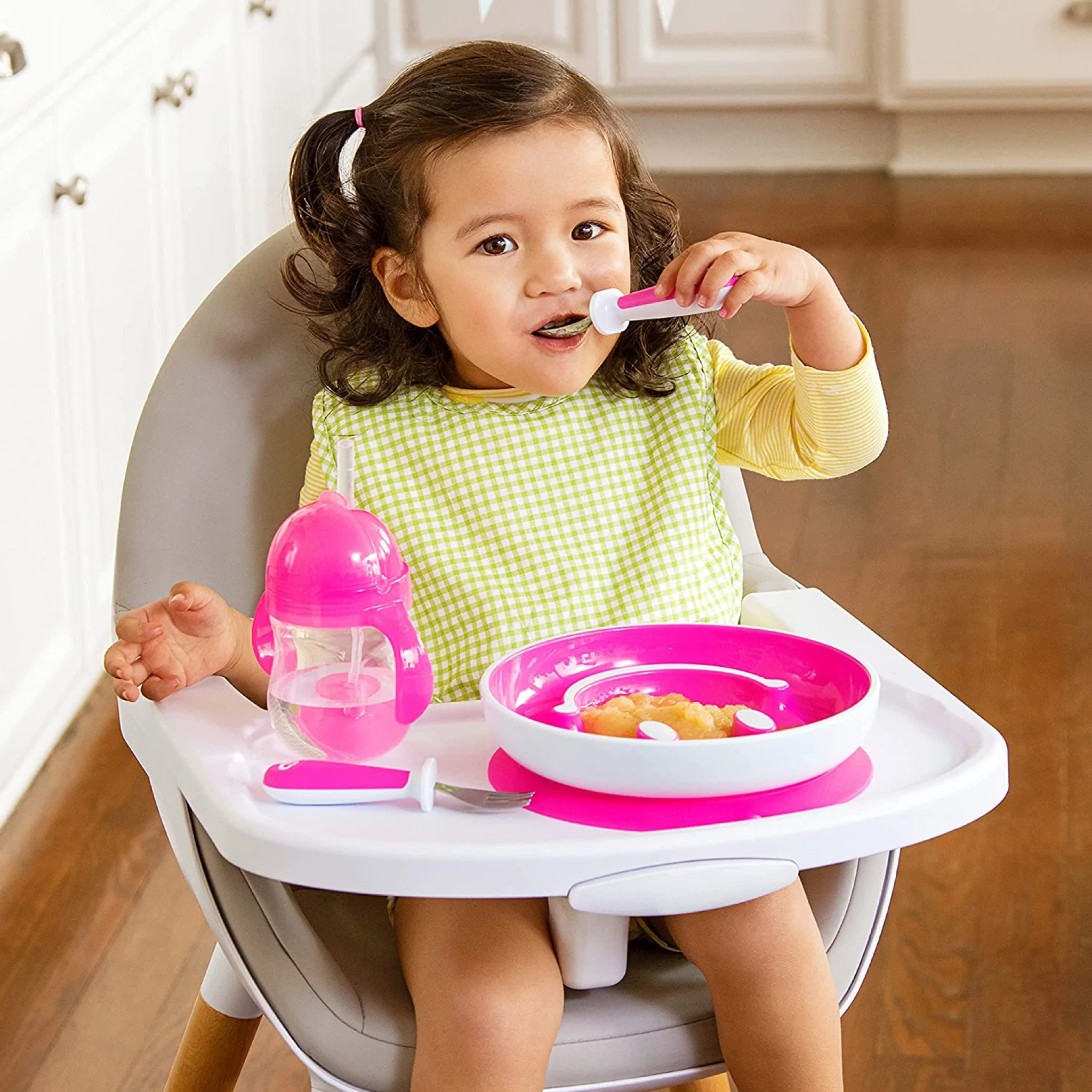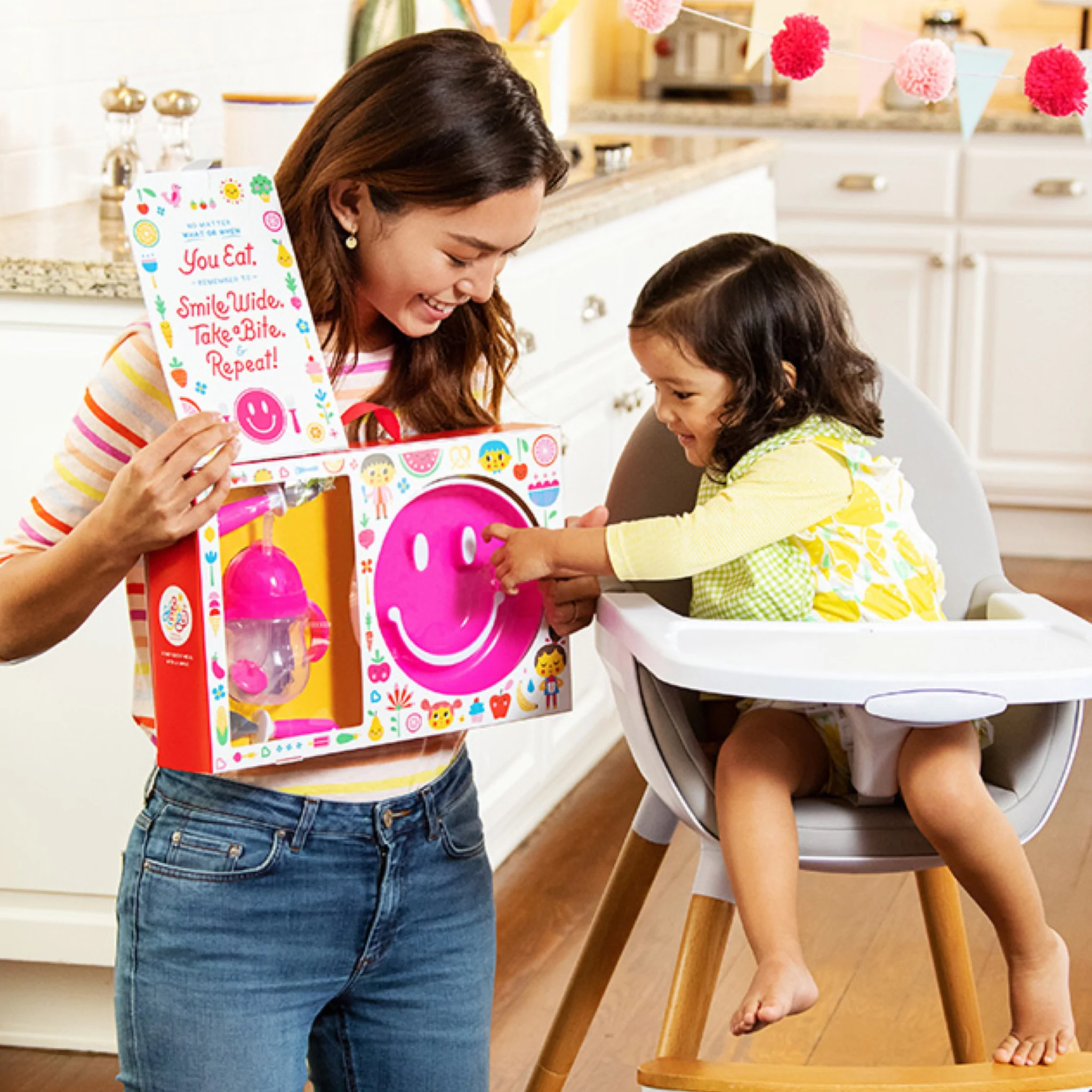 Nuestros cubiertos Raise, con diseño ergonómico, cuentan con bases especiales que mantienen las puntas alejadas de mesas y suelos (¡todo un logro!). Nuestro plato con ventosa Smile ‘n Scoop permanece siempre estable, y el Vaso de entrenamiento calibrado permite a los niños beber desde cualquier ángulo sin derramar nada. Todo en un solo paquete que asegurará una sonrisa en las caritas de los peques. ¡Un hurra por hacer las comidas menos caóticas y más divertidas!
