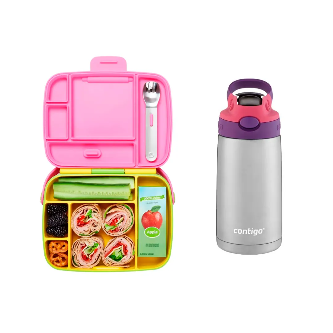Incluye la lonchera Munchkin, con compartimentos prácticos y un juego de cuchara y tenedor de acero inoxidable. Su diseño permite organizar los alimentos de forma segura y sin derrames.