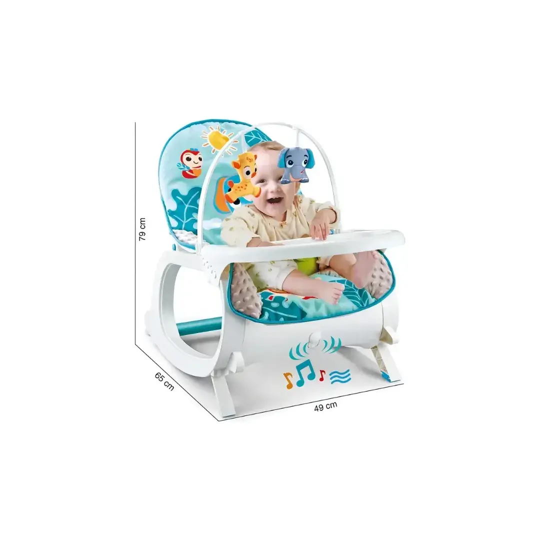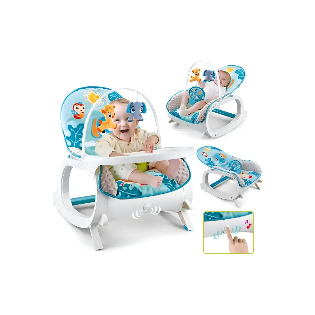 La silla mecedora para bebé es perfecta para acompañar los momentos de descanso y juego. Cuenta con función de vibración calmante y música integrada que ayuda a relajar al bebé. Incluye un arco desmontable con juguetes colgantes que estimulan la coordinación y el desarrollo sensorial.