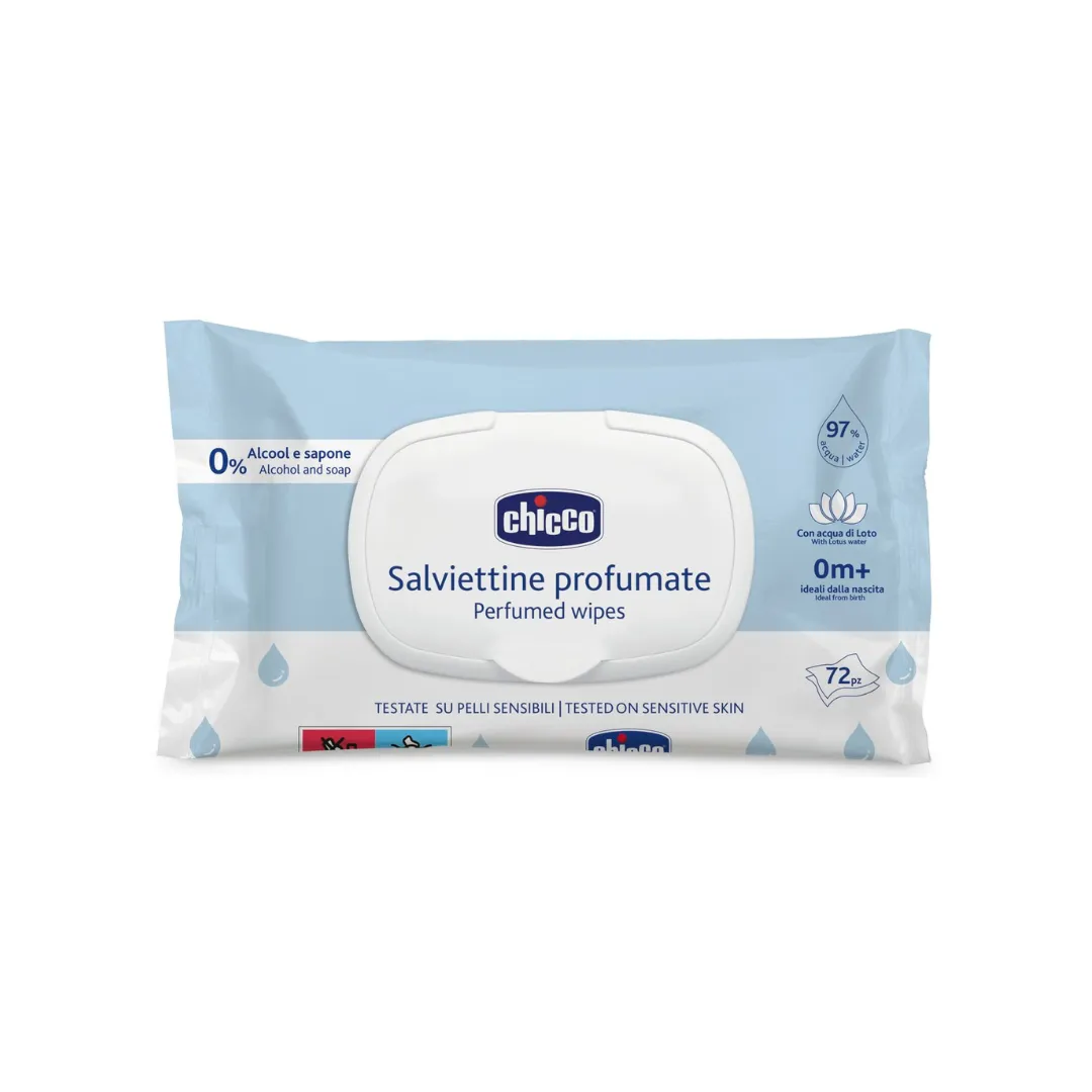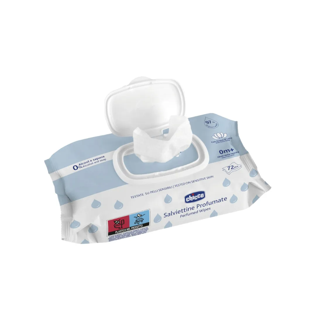 ¡Presentamos las Toallitas Húmedas Perfumadas de Chicco! Especialmente diseñadas para el cuidado delicado de la piel de tu bebé, estas toallitas están dermatológicamente probadas en pieles sensibles, lo que las hace ideales desde el nacimiento (0m+).